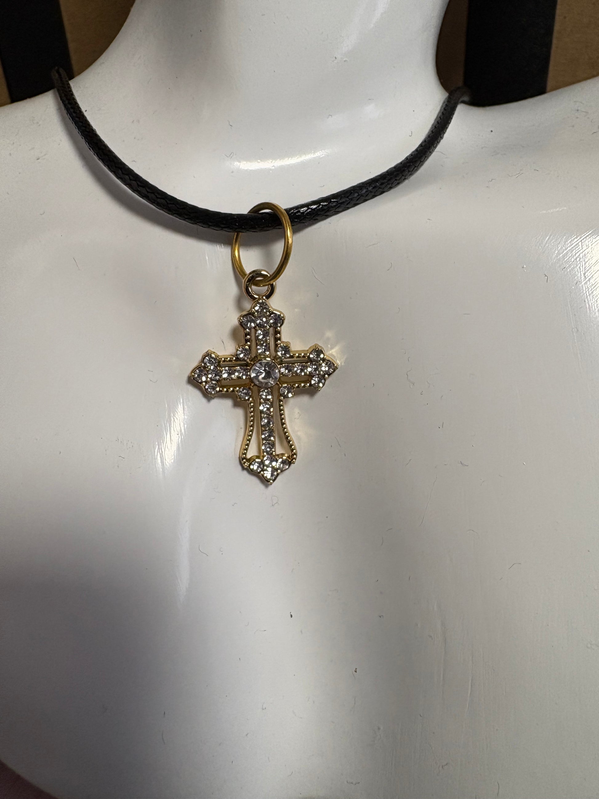 A gold cross on a waxed necklace, Necklace length: 9cm Circumference
