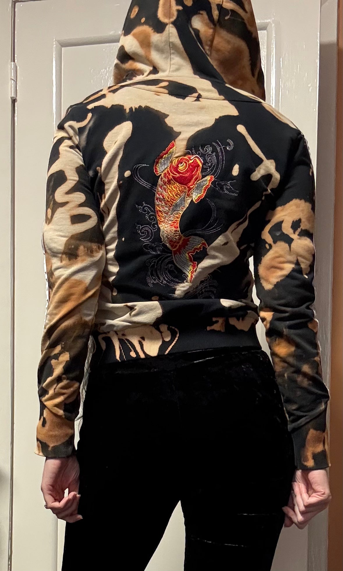 An upcycled Hoodie, done with bleach and embroidery thread. In a size 10 depending on desired fit.